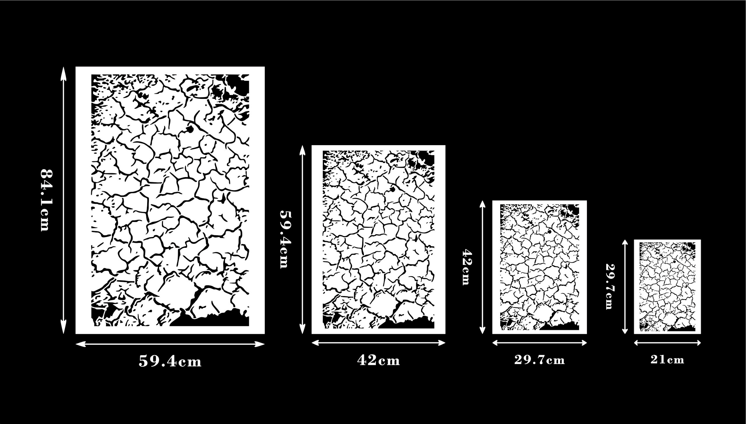 29,7cm x 21 cm, 42 cm x 29,7 cm, 59,4 cm x 42 cm, 84,1 cm x 59,4 cm