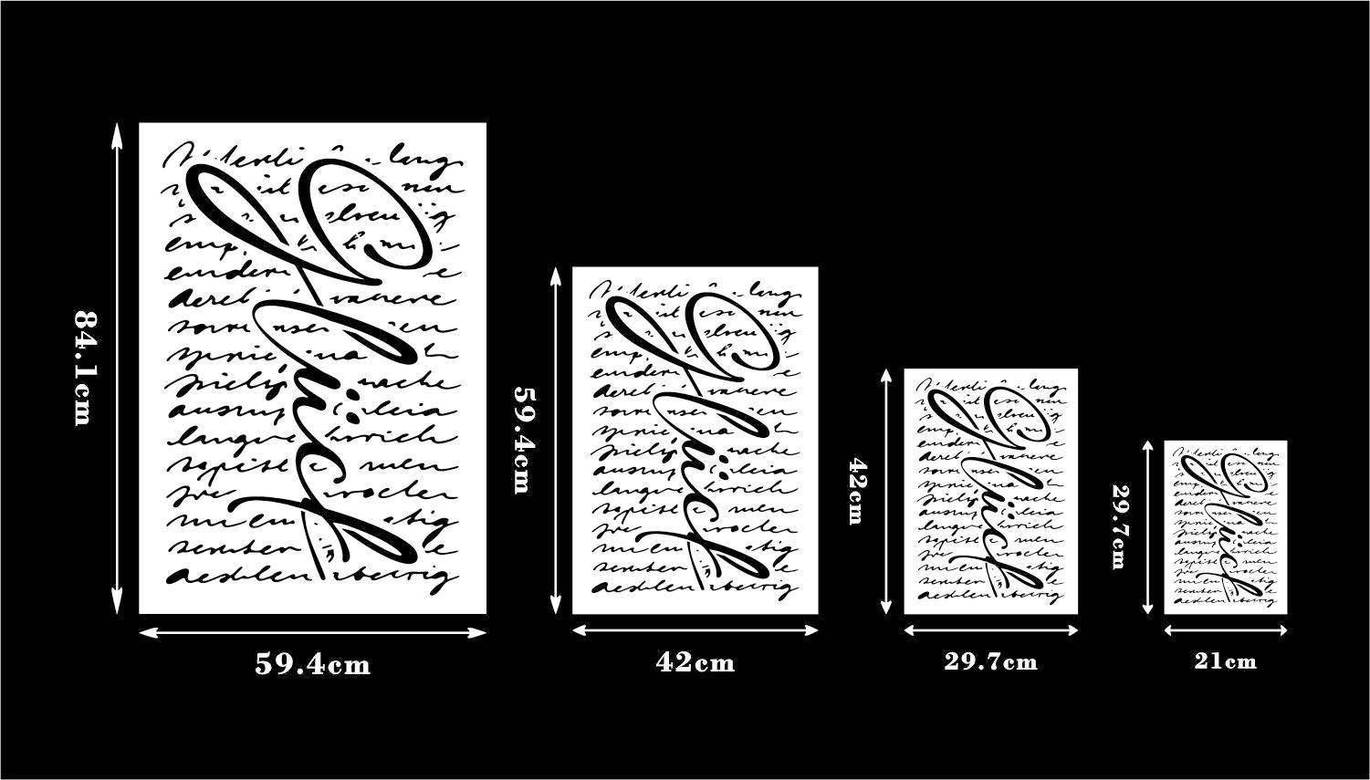 29,7cm x 21 cm, 42 cm x 29,7 cm, 59,4 cm x 42 cm, 84,1 cm x 59,4 cm