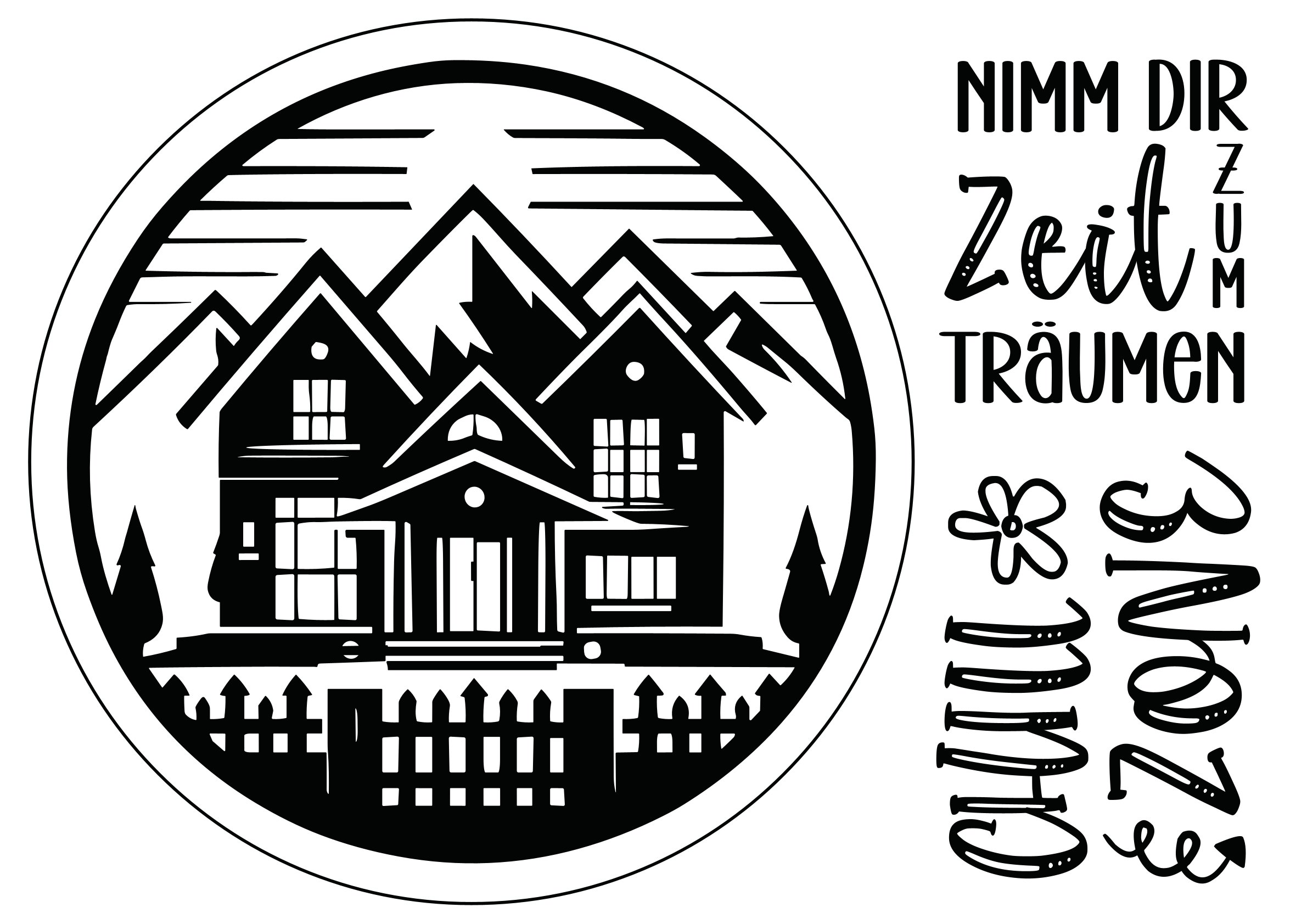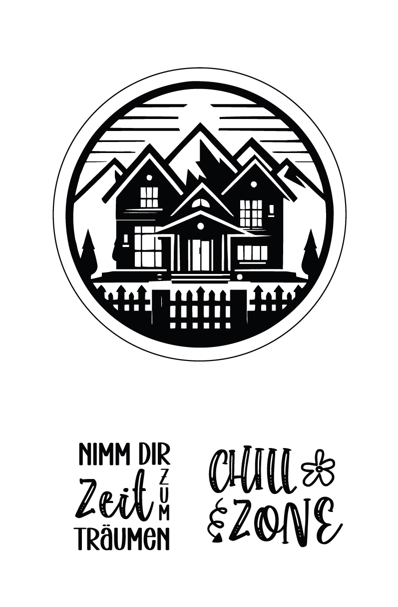 Alpenpanorama mit Haus – Chill Zone – Nimm dir Zeit zum träumen – Selbstklebende Siebdruck-Schablone