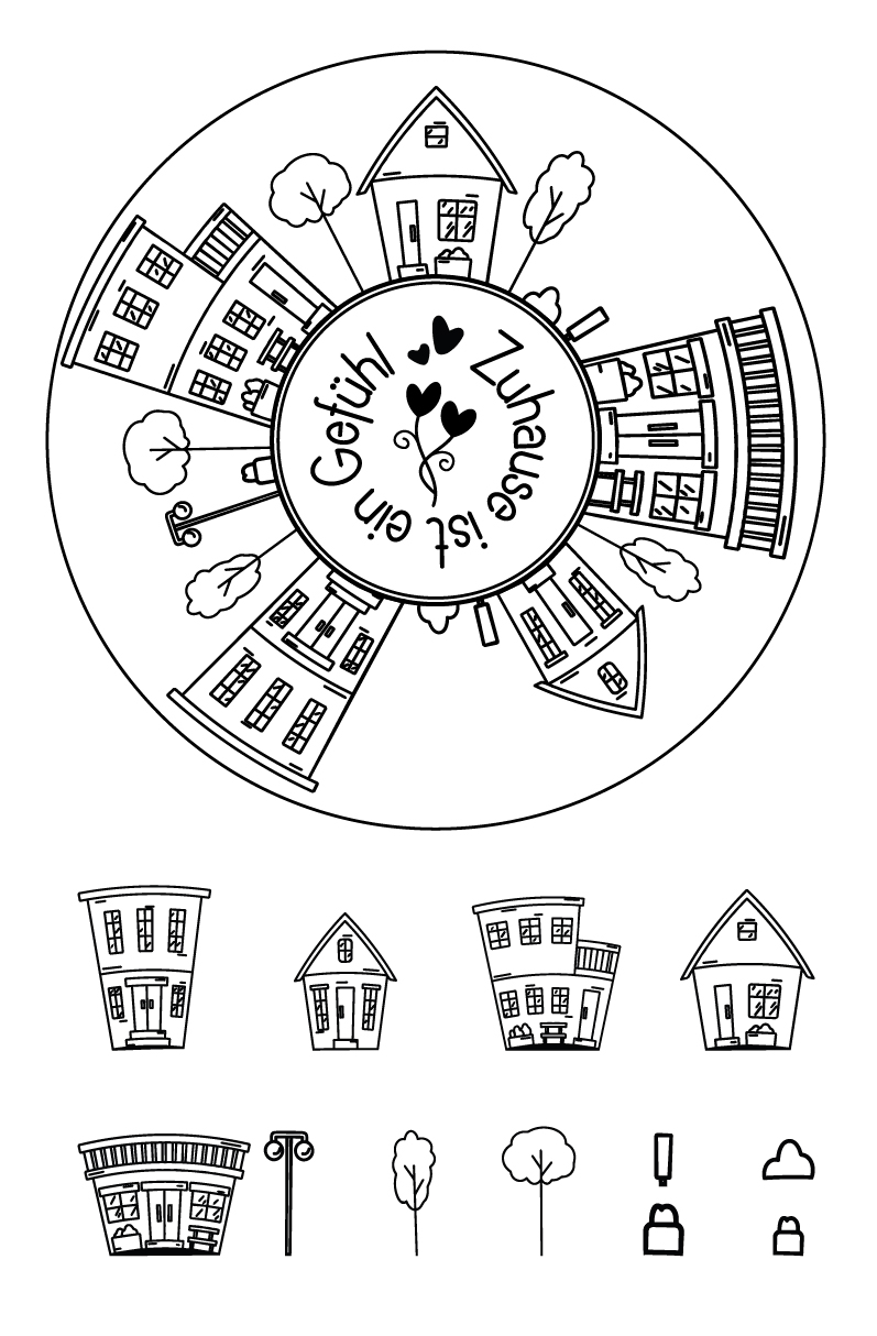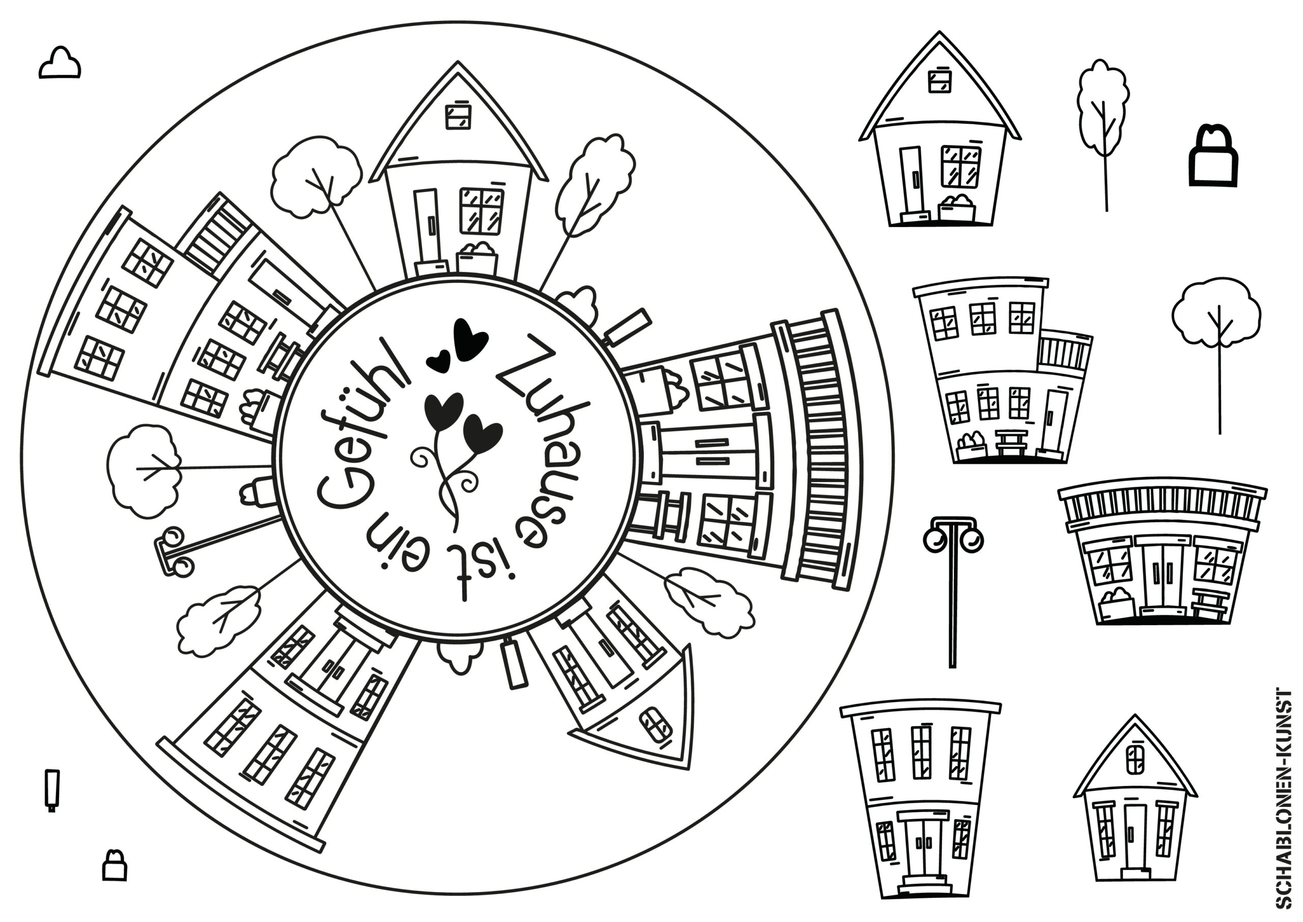 „Runde Häuserwelt – Zuhause ist ein Gefühl“ – Selbstklebende Siebdruck-Schablone